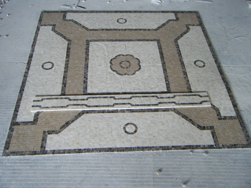 El patrón de piso de mosaico de arte de mármol es un diseño hermoso e intrincado creado con baldosas de mármol. El patrón presenta una combinación de varios colores y texturas de mármol que se unen para formar una impresionante obra de arte. Cada mosaico se corta y está dispuesto cuidadosamente para crear un patrón cohesivo y estéticamente agradable en el piso. La vía natural y las variaciones del mármol agregan un toque de elegancia y singularidad al mosaico. Este patrón de piso artístico es perfecto para agregar un toque lujoso y sofisticado a cualquier espacio, ya sea un entorno residencial o comercial.